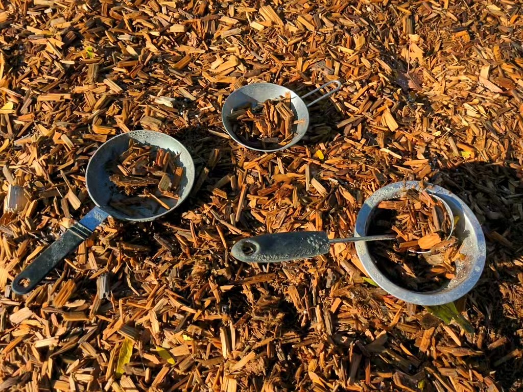 The Early Years group were exploring wood chips along with various real kitchen utensils. The loose parts in this play were kitchen utensils and wood chips.